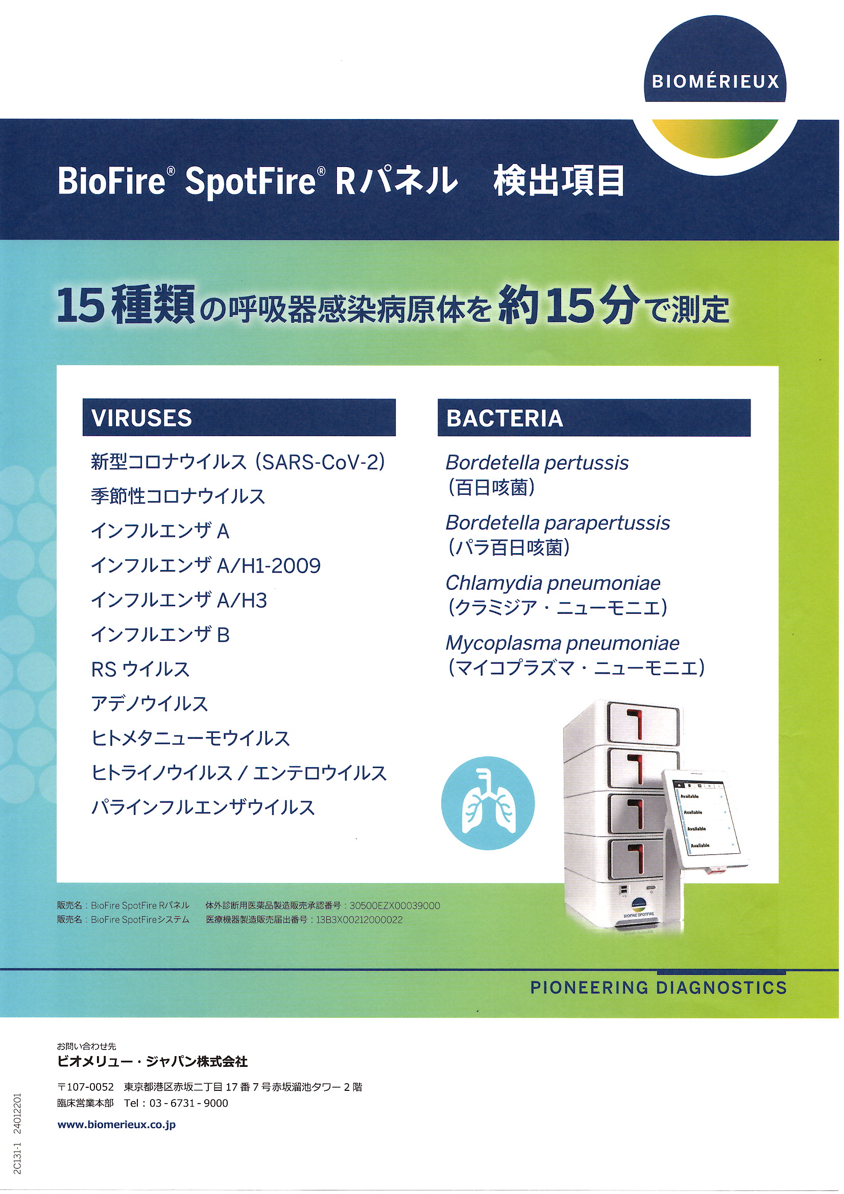 多項目同時PCR検査機器を導入いたしました。(BioFire SpotFire Rパネル)約15分で15種類の病原体の検査が実施可能となります。